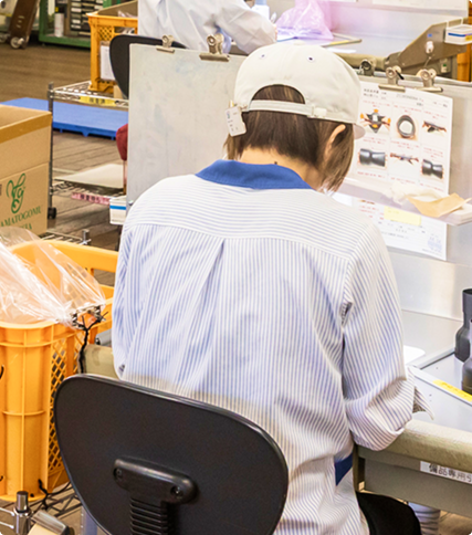 製品のキズや形状を確認します。全ての工程で「後工程はお客様」の意識を持ち自工程での不良発生を防止して行きます。
