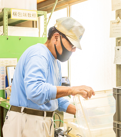 検査済みの製品を計量係に回し、メーカー様指定の梱包方法にて丁寧に梱包する作業をしています。